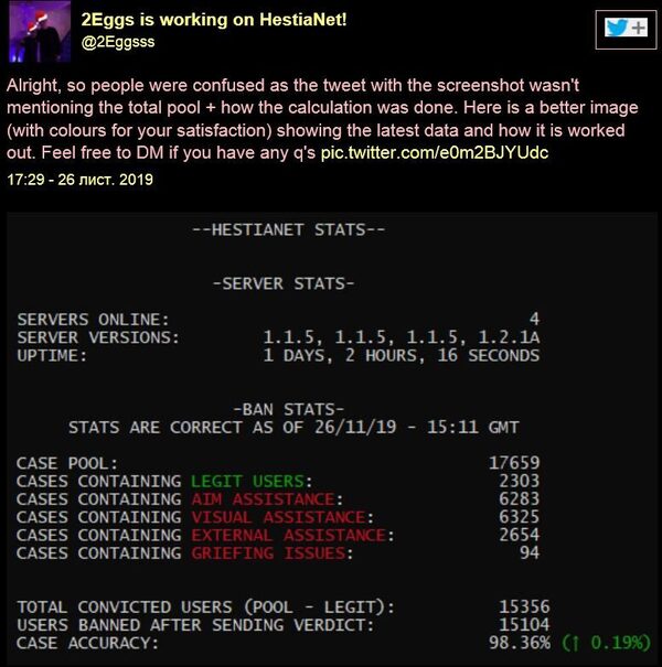 Невероятно, но факт, игрок под ником 2Eggs создал программу (ИИ) — HestiaNet, которая умеет анализировать поведение игроков в CS:GO. Система замечает подозрительное поведение с поразительной точностью: из более чем 17 тыс. игроков помеченных ИИ как подозрительные, читерами оказались 15 104.