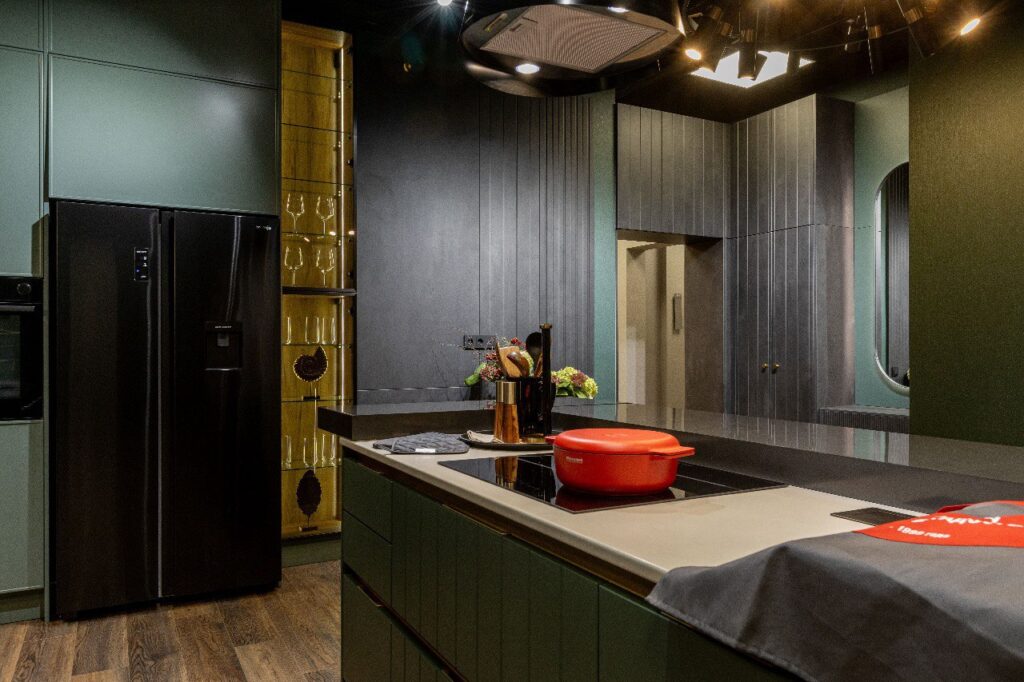 Активную кухню создатели шоурума сделали его изюминкой. Кухня подключили ко всем коммуникациям и оснастили необходимой техникой, включая посудомоечную машину, холодильник, вытяжку, духовой шкаф, варочная панель. В скором времени здесь запланировано проведение кулинарных мастер-классов.