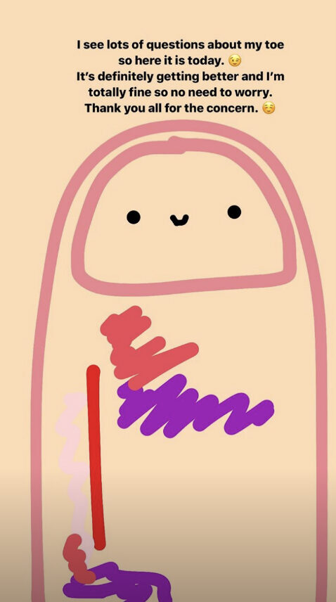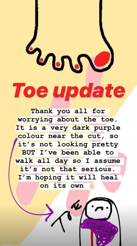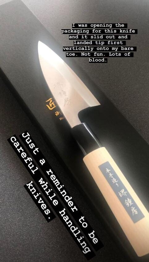 Все было отлично до того момента, как не произошло следующее: Марция, пытаясь достать недавно купленный нож из упаковки, уронила его на свою ногу. Острие попало в палец девушки. В Instagram она опубликовала собственноручно нарисованную картинку, по которой понятно, в каком состоянии находится рана сейчас.