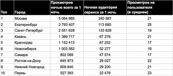 На первом месте оказалась Москва — в среднем жители города совершают более 5 миллионов просмотров за ночь, второе место занял Екатеринбург (более 2,7 миллионов просмотров), а тройку лидеров замкнул Санкт-Петербург (более 2,5 миллионов). Казань и Краснодар закрыли топ-5. Во вторую пятерку лидеров вошли Новосибирск, Самара, Ростов-на-Дону, Нижний Новгород и Пермь.