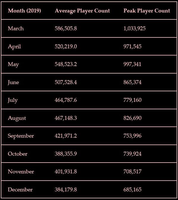 Хоть Valve и осыпали Dota 2 весь 2019 год обновлениями, плодов это не принесло, аудитория уменьшилась существенно, по среднему показателю числа игроков игра опустилась до уровня 2014 года, т. е. до 380+ тыс. человек. Ещё в марте 2019 года онлайн был 580 тыс. человек.