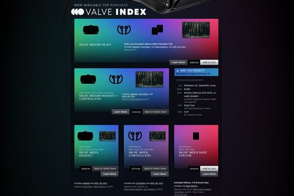 После анонса Half-Life: Alyx спрос на Valve Index значительно вырос, устройства буквально сметают с полок магазинов, например в США и Канаде в Steam уже нельзя купить гарнитуру, т. к. все комплекты раскуплены, а на странице вывешено объявление «Ожидается поставка». В Японии реализацией гарнитуры занимается партнёр DegicaFAN, и судя по всему, контроллеры уже распроданы.