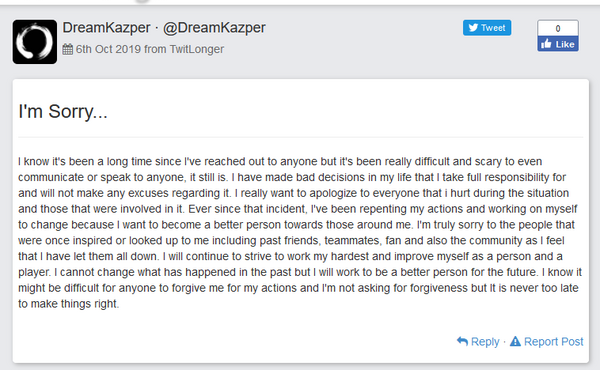 Бывший профессиональный игрок OWL и участник Boston Uprising, Джонатан DreamKazper Санчес делает первое публичное заявление после долгого времени. В своем Twitter Джонотан опубликовал сообщение под названием “Мне жаль”, в котором извинился перед фанатами и коллегами. Также DreamKazper признался, что ранее он не мог говорить, потому что испытывал страх.