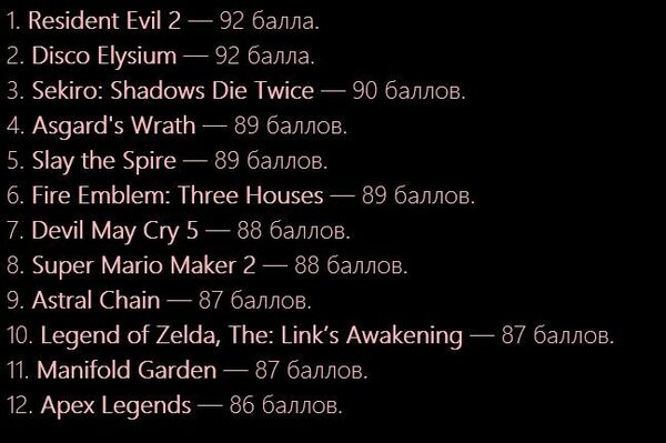 Первое место разделили римейк Resident Evil 2 и детектив Disco Elysium, набрав по 92 очка из 100. На втором боевик с восточным колоритом Sekiro: Shadows Die Twice, он взял 90 очков. Ну и замыкает тройку лидеров скандинавский мифологический экшен Asgard’s Wrath. Как расположились остальные места смотрите на скрине ниже.