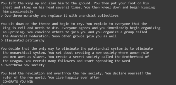 Возможностей в играх становится всё больше, но разработчик Nick Walton решил форсировать события, и создал текстовую приключенческую игру AI Dungeon 2, практически с бесконечными возможностями, непредсказуемой вариативностью, основанной на самообучающемся искусственном интеллекте OpenAI.
