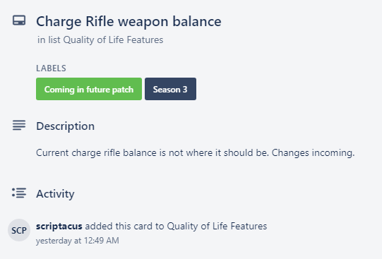 К сожалению, доска Trello на самом деле не указывает, какие изменения они вносят в оружие. Возможно, что они могут уменьшить выходной урон или увеличить продолжительность активности луча в попытке ослабить его силу.