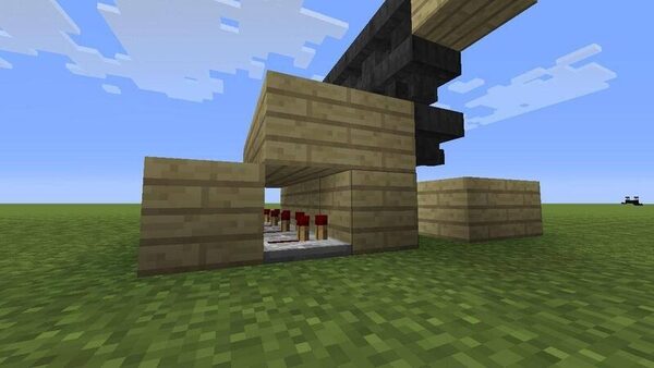 Теперь, вам нужно создать платформу рядом с нашими загрузочными воронками размером 2×4 блока и как показано на 2-м скриншоте разместить 4 красных повторителя.
