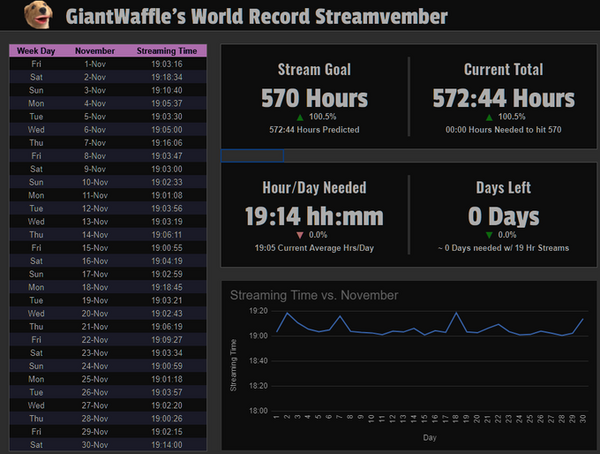 В своём твиттере стример опубликовал статистику за месяц марафона, в которой видно, что его канал просмотрело более 3 млн зрителей, и более 10 тыс. подписалось. Однако GiantWaffle называет такую практику «нездоровой», и подобные соревнования «изматывающими, доводящими до предела».