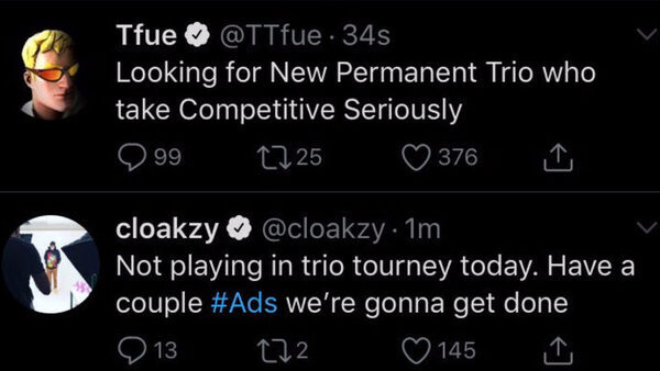 Tfue также заявил, что они должны будут возместить ему деньги, а тот вернется в команду. Очевидно, что Cloak не слишком обеспокоен случившимся, даже критикуя Тенни за то, что он отказался от такого выгодного предложения.