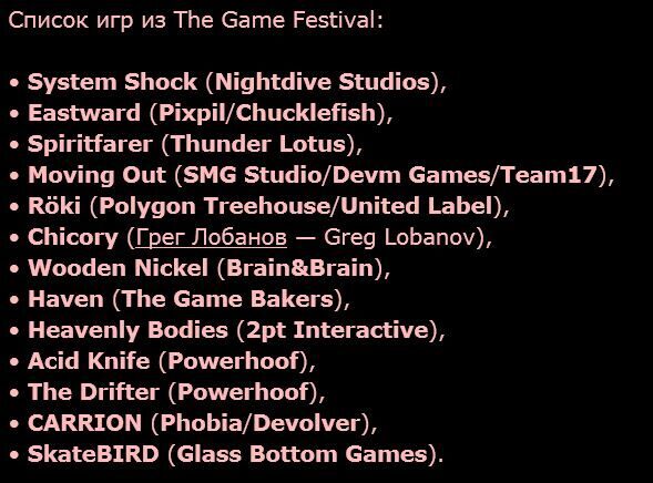 The Game Festival стартует раньше самой церемонии награждения, 12 декабря в 21:00 (GMT+3), и продлится до 14 декабря. Когда «фестиваль» завершится, представленные на нём игры будут убраны из Steam.