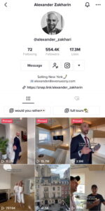 — Я видела и понимала, что риелторская индустрия играет огромную роль в экономике и жизни Нью-Йорка. Однажды случайно познакомилась с крутым Манхэттенским риелтором, Александром Захариным, когда-то переехавшим в Нью-Йорк из России, и предложила ему попробовать выйти на другой уровень. Мы начали работать вместе и уже спустя всего несколько месяцев у него подписчиков стало не 90к, а 300к. А на днях отпраздновали уже 550к!
