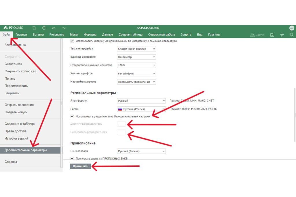 Для этого необходимо в редакторе таблиц «Р7-Офис» перейти во вкладку «Файл» и выбрать в меню пункт «Дополнительные параметры». В правой части экрана опция «Использовать разделители на базе региональных настроек» активна по умолчанию. Чтобы использовать особые разделители, необходимо снять флажок и в расположенных ниже полях «Десятичный разделитель» и «Разделитель разрядов тысяч» ввести нужные символы. Чтобы сохранить внесенные изменения, надо нажать кнопку «Применить».